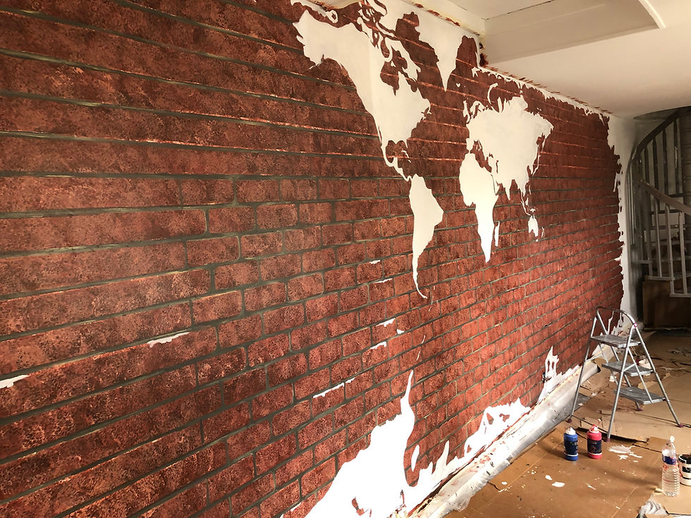 Elle imagine alors un trompe-l’œil original : une carte du monde semblant apparaître à travers un mur de briques mis à nu. Comme si le revêtement s’était effacé pour révéler la matière brute, tout en conservant la forme du monde.